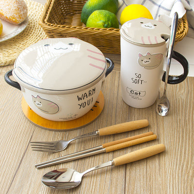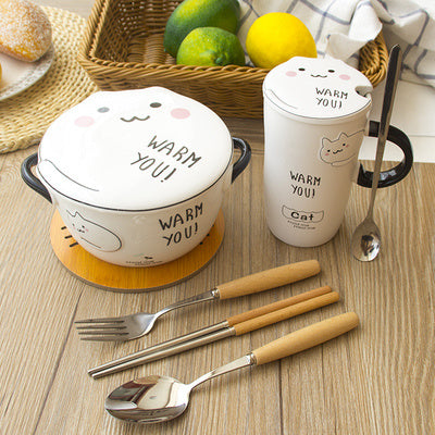 تتميز برسومات قطط لطيفة على السطح مع عبارات مضحكة ولمسات صغيرة، وتأتي مع غطاء مزين بوجه قطة مرسوم يدويًا، مما يجعله يبدو في غاية الروعة والجمال. يضمن الغطاء بقاء قهوتك دافئة ونضرة، ويحتوي على شق صغير لإبقاء الملعقة في الكوب.