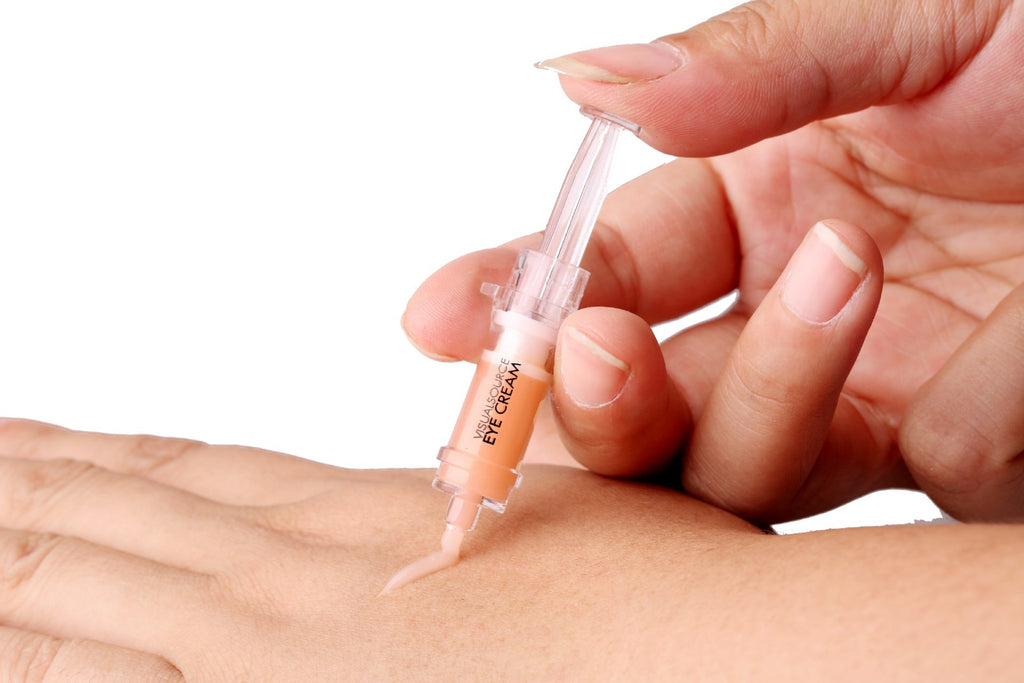 1. Squeeze out pea-size eye cream, and use your fingertips to apply on the eye bags