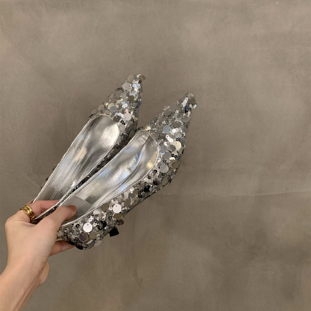 صندل فرنسي من الأقليات ذو كعب عالٍ فضي اللون ومقدمة مغلقة