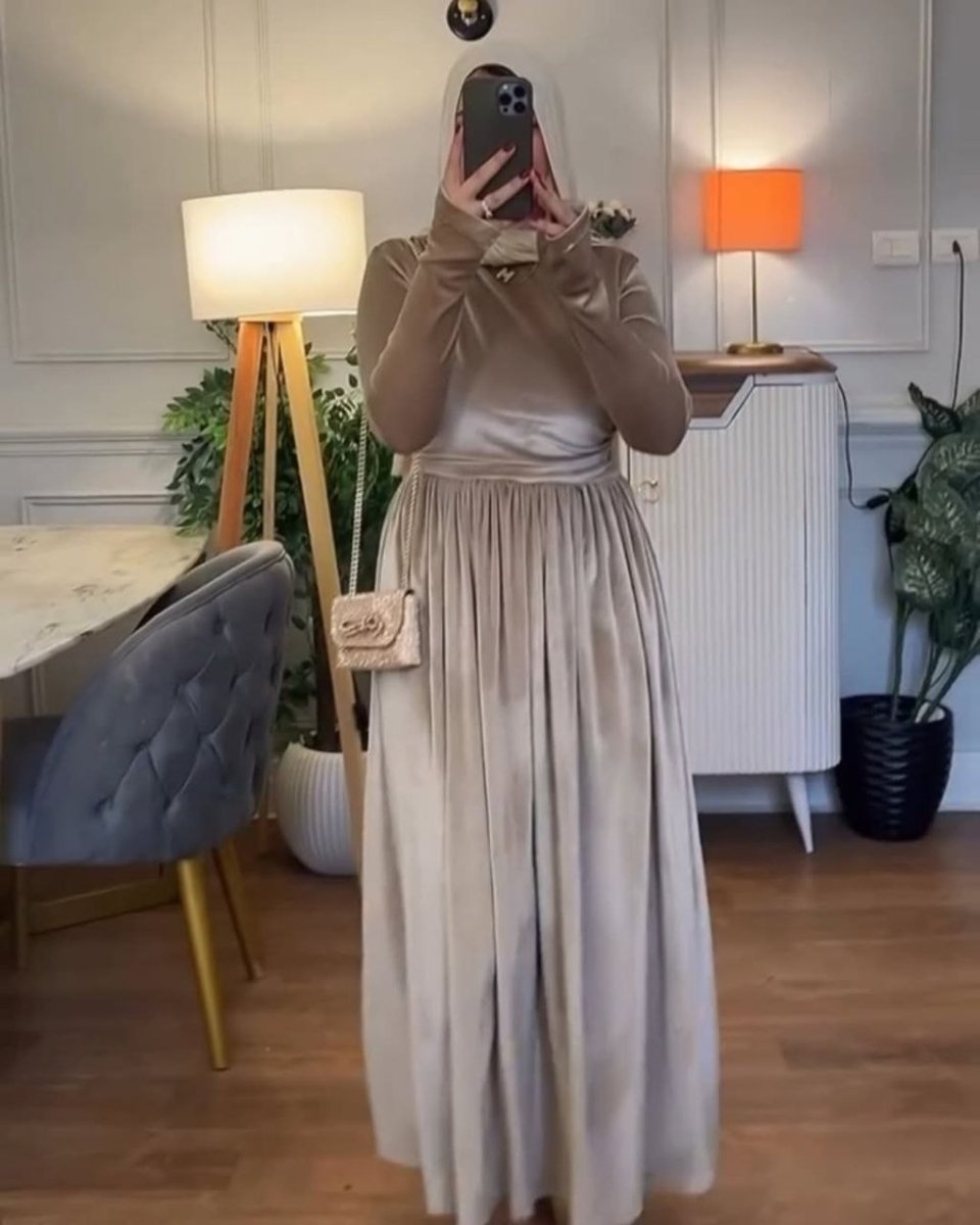 دريس أنيق بخامة قطيفة فرنساوي ناعمة ودفاية، تصميمه بسيط وشيك يبرز جمال القَصّة مع راحة في اللبس وانسيابية على الجسم، مناسب للخروجات والمناسبات وإطلالة شتوية فخمة.