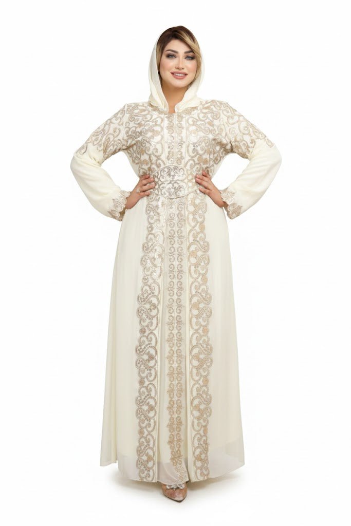 عباية بتصميم فاخر يعكس الهيبة والرقي، تتميز بتطريز طولي متقن يمتد على الواجهة ويمنح القطعة طولًا بصريًا وأناقة واضحة. القَصّة واسعة وانسيابية مع تحديد ناعم عند الخصر يبرز الشكل بطريقة أنثوية متوازنة، بينما تضيف الأكمام الواسعة إحساسًا بالفخامة والراحة. التفاصيل الدقيقة في التطريز تعكس حرفية عالية واهتمامًا استثنائيًا، ما يجعل العباية خيارًا مثاليًا للمناسبات الراقية والظهور الرسمي المميز.