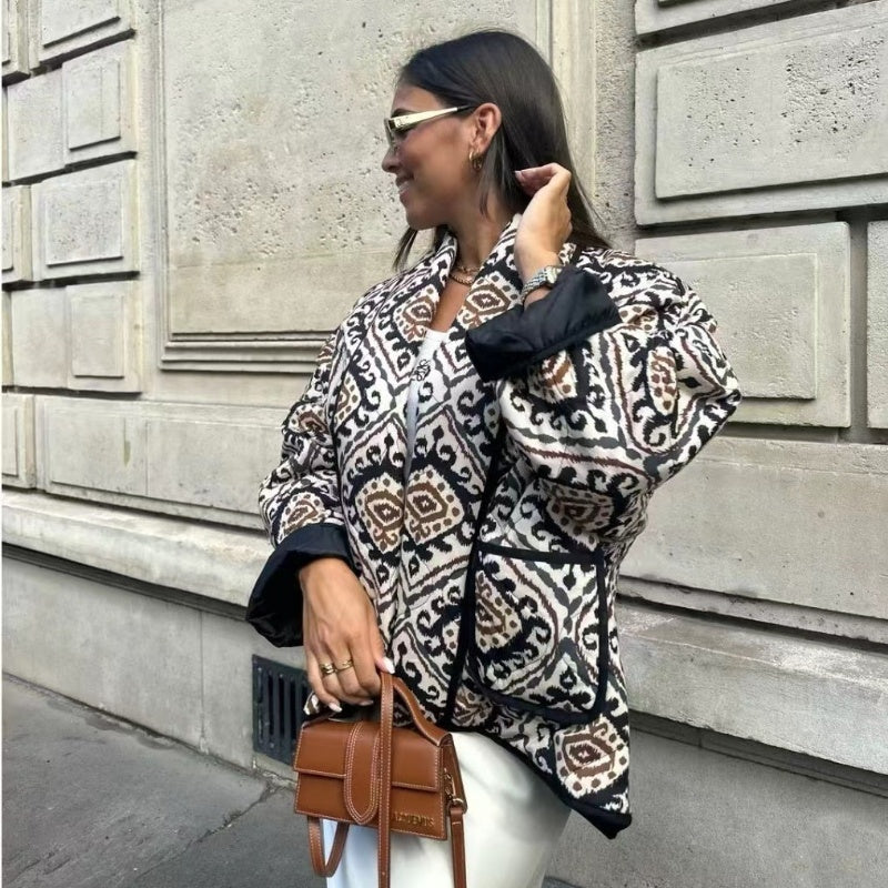 Fashion Printed Fake Two Pieces Contrast Color Small Stand Collar Cotton-padded Coat