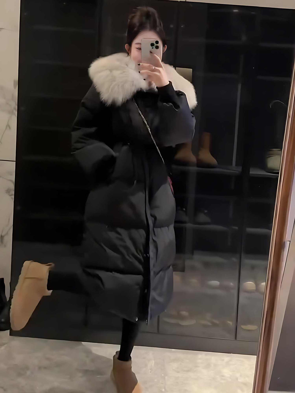 Color classification: black fur collar mid-length down jacket