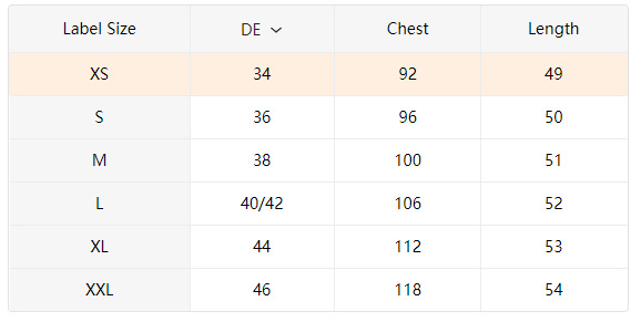 Sizes: XS, S, M, L, XL