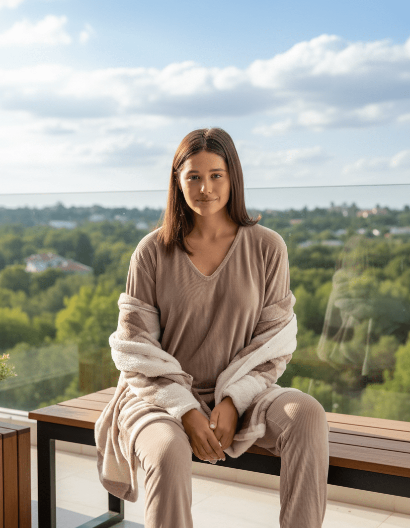 استمتعي بأقصى درجات الدفء والأناقة مع طقم بيجامة شتوي مكوّن من 3 قطع: بلوزة بأكمام طويلة، بنطلون مريح، وروب كاروه مبطن بلمسة فرو ناعمة يمنحك إحساس فاخر في البيت.