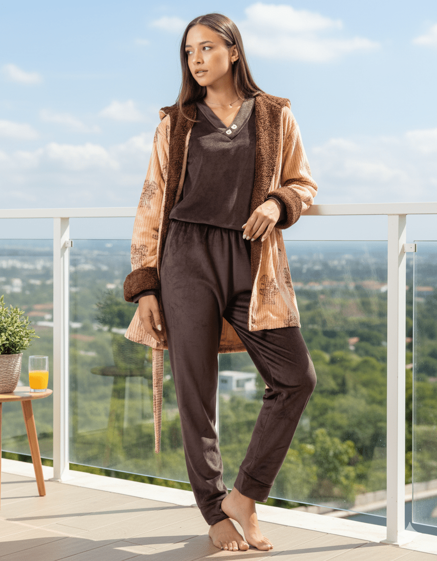 استمتعي بإطلالة بيتية أنيقة ومريحة مع طقم بيجامة حريمي مكوّن من 3 قطع: توب قطيفة، بنطلون بخصر مطاطي مريح، وروب بقبعة مبطن يمنحك دفء إضافي في الأيام الباردة.