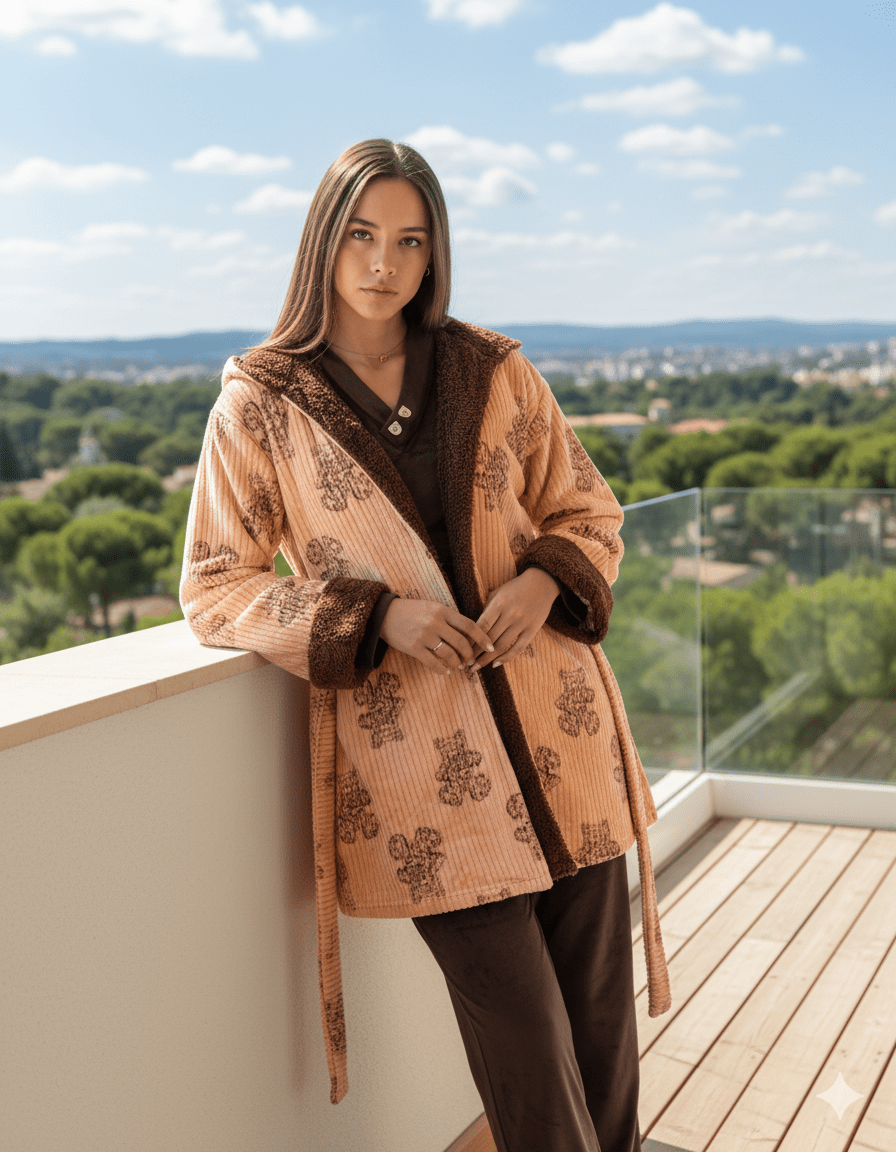 مصنوع من خامة قطيفة ناعمة بملمس مخملي لطيف على البشرة، توفر إحساس دافئ ومريح طوال اليوم. تصميم عملي بقصة مريحة يناسب أوقات الاسترخاء داخل المنزل، مع تفاصيل عصرية تضيف لمسة أنيقة لإطلالتك الشتوية.
