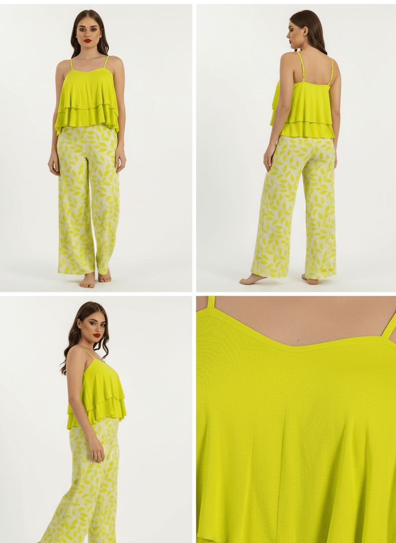 استمتعي بإطلالة منعشة ومريحة داخل المنزل مع طقم البيجامة النسائي العصري المصمم ليجمع بين الأناقة والراحة. يتميز الطقم بتوب بحمالات بتصميم طبقات أنثوي جذاب يمنحك مظهرًا أنيقًا، مع بنطلون واسع مريح يوفر حرية حركة كاملة طوال اليوم.