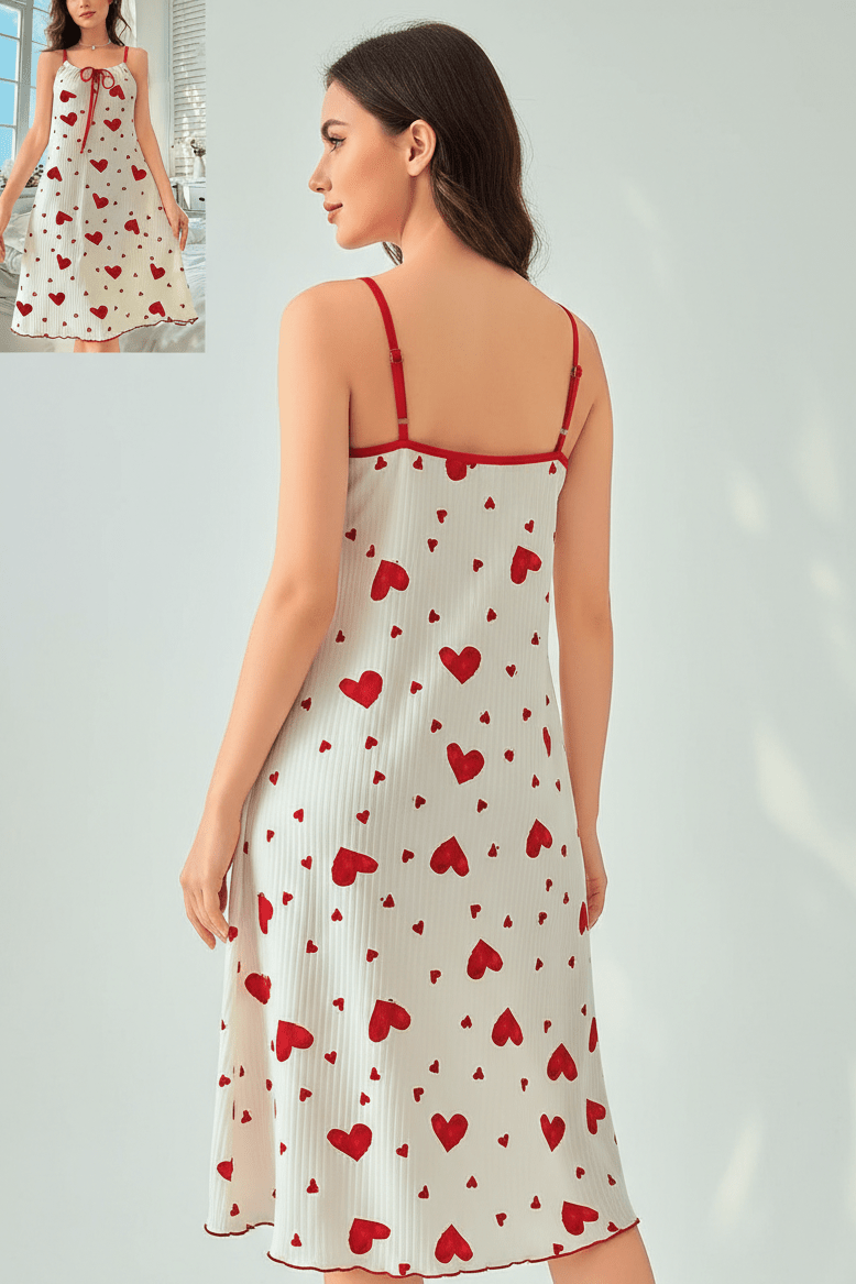 قصة واسعة وانسيابية مع طبعة قلوب جذابة تضيف لمسة حيوية وأنثوية، مثالي للبيت أو للاسترخاء أو حتى كنايت دريس مريح للنوم.