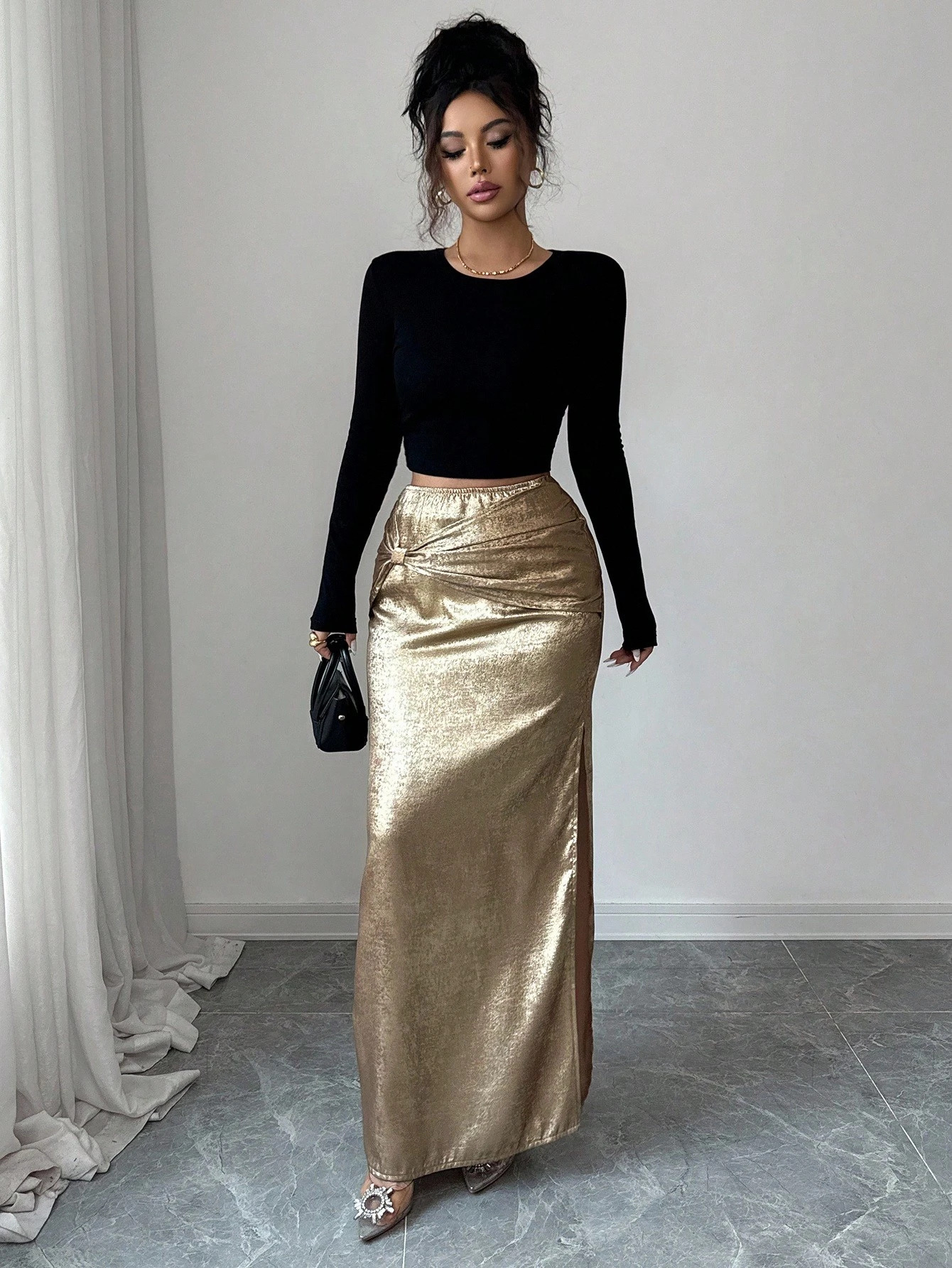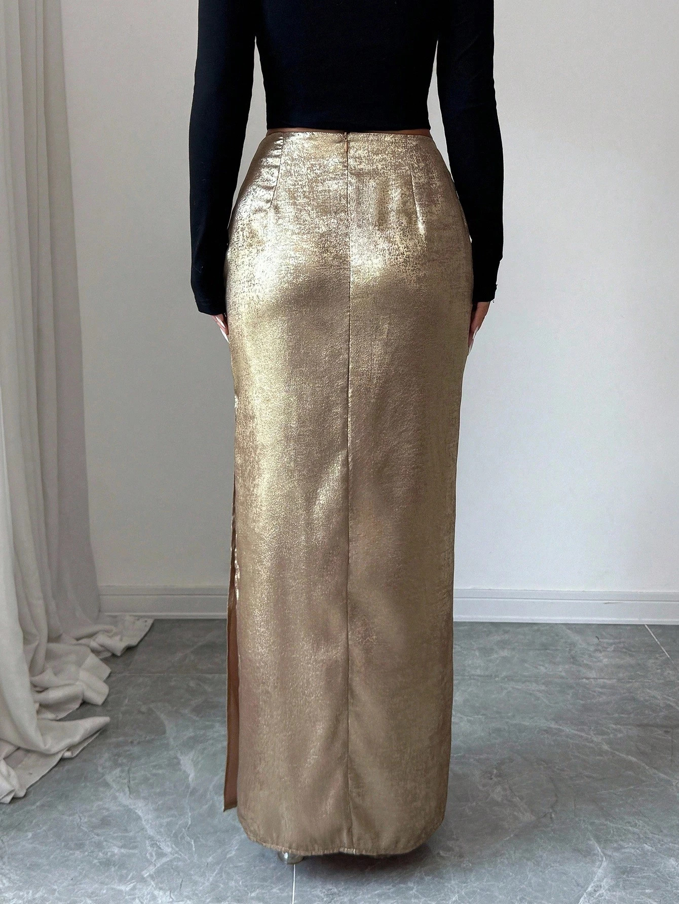 - Women's Metal-Embellished Pleated Bodycon Skirt With Slit Slimming Design