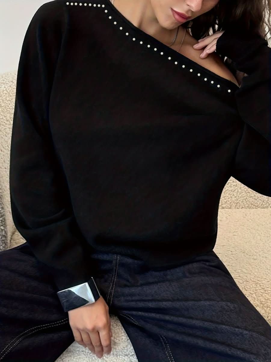 Womens Knitted Top With Rivet-Embellished Slanted Shoulders And Long Sleeves