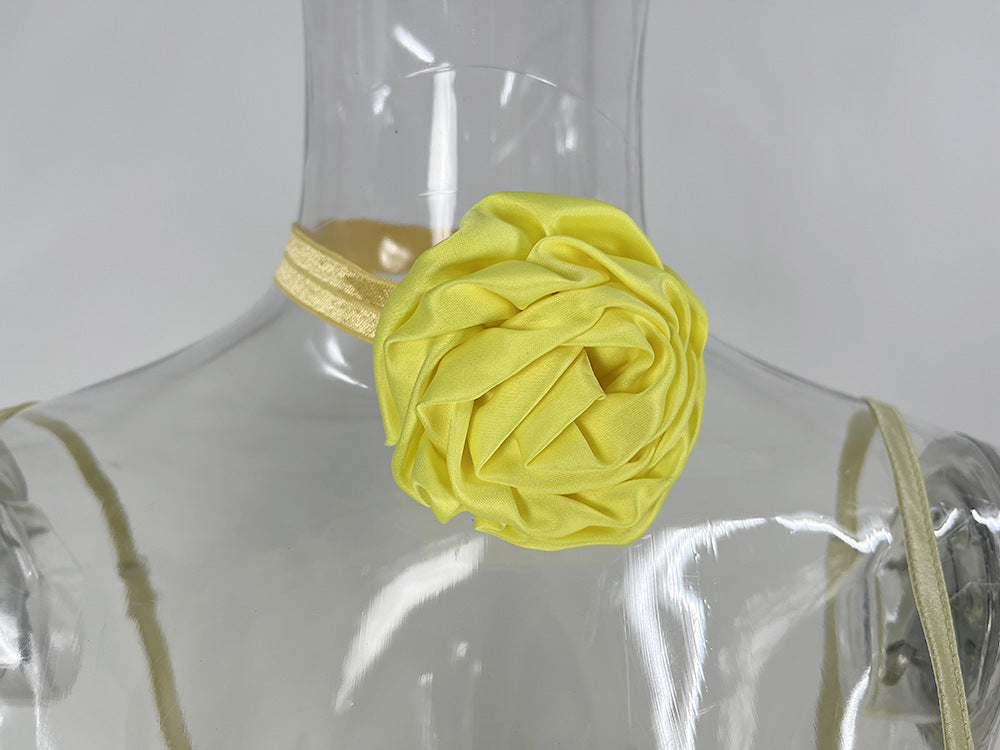Color: yellow dress, black dress, white dress, yellow flowers, black flowers, white flowers