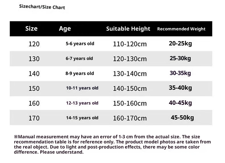 Suitable height: 120cm [recommended 15.00 kg-20.00 kg], 130cm [recommended 20.00 kg-25.00 kg], 140cm [recommended 25.00 kg-35.00 kg], 150cm [recommended 35.00 kg-45.00 kg], 160cm [recommended 45.00 kg-55.00 kg], 170cm [recommended 55.00 kg-65.00 kg]]