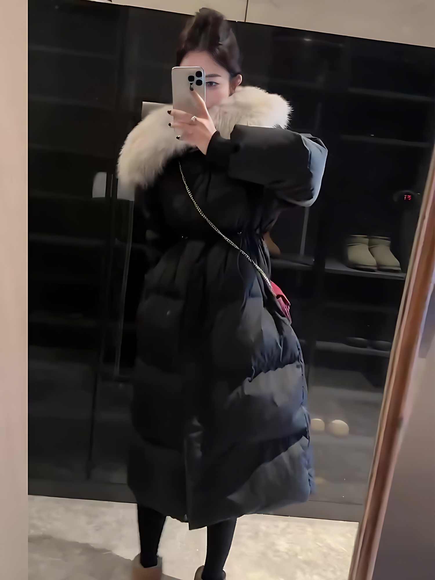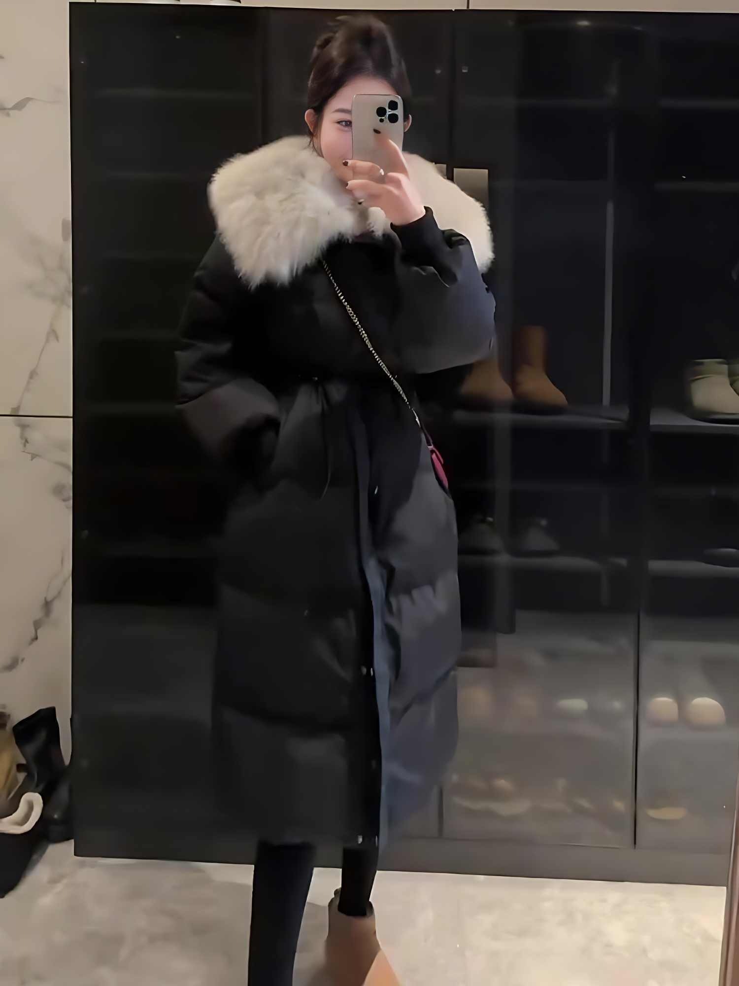 Color classification: black fur collar mid-length down jacket