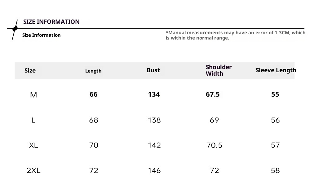 1. Asian sizes are 1 to 2 sizes smaller than European and American people. Choose the larger size if your size between two sizes. Please allow 2-3cm differences due to manual measurement. 2. Please check the size chart carefully before you buy the item, if you don't know how to choose size, please contact our customer service. 3.As you know, the different computers display colors differently, the color of the actual item may vary slightly from the following images.