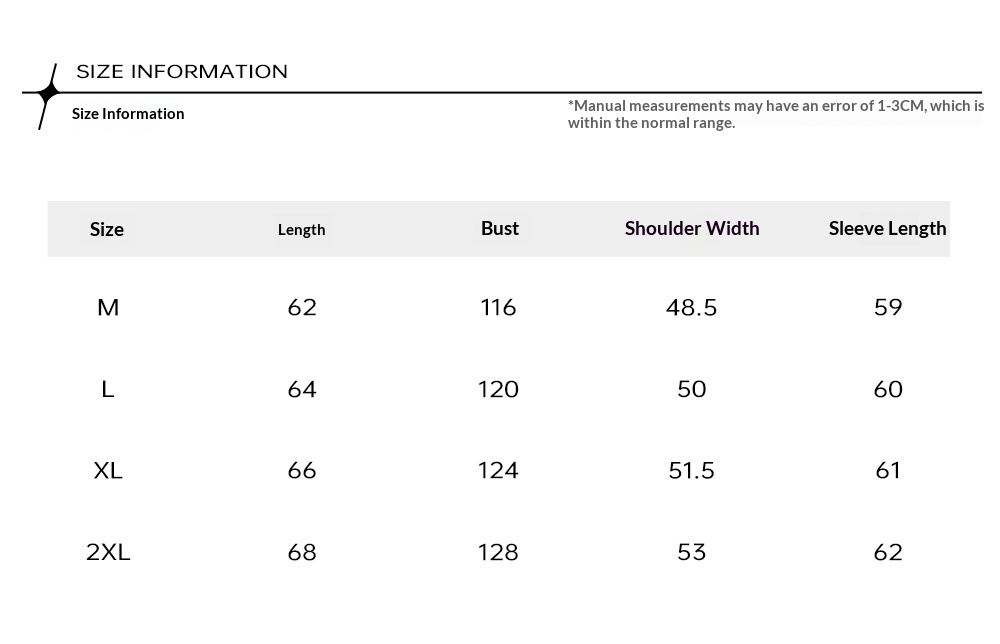 1. Asian sizes are 1 to 2 sizes smaller than European and American people. Choose the larger size if your size between two sizes. Please allow 2-3cm differences due to manual measurement. 2. Please check the size chart carefully before you buy the item, if you don't know how to choose size, please contact our customer service. 3.As you know, the different computers display colors differently, the color of the actual item may vary slightly from the following images.